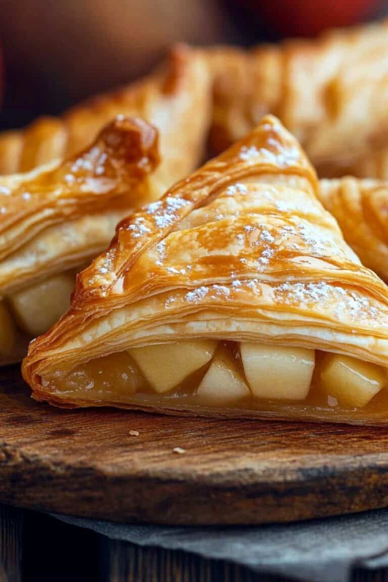 To make apple turnovers, cut some puff pastry into squares and spoon apple filling into the center.