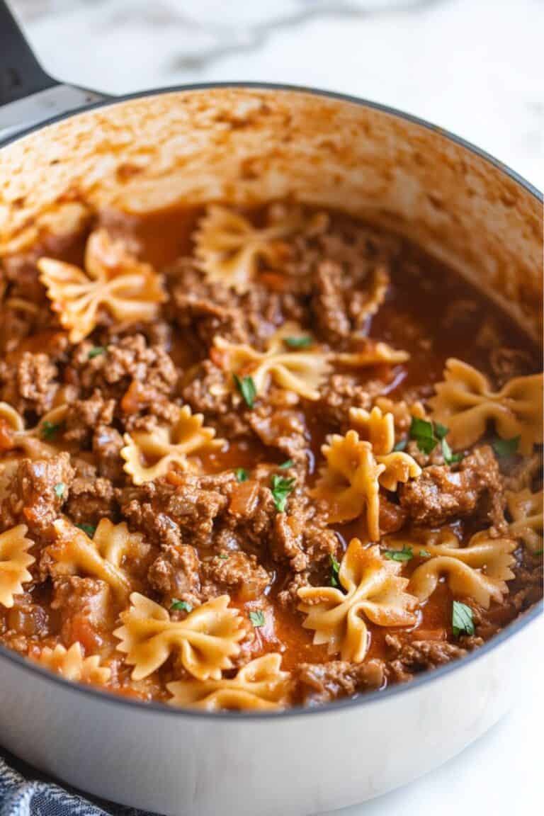 I make this creamy beef and bow tie pasta all the time, mostly because my kids inhale it and my husband always goes back for another scoop!