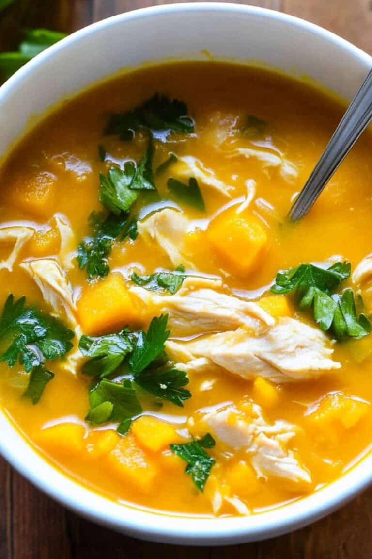 Sauté onion, garlic, and diced chicken breast until golden before adding the squash and broth.