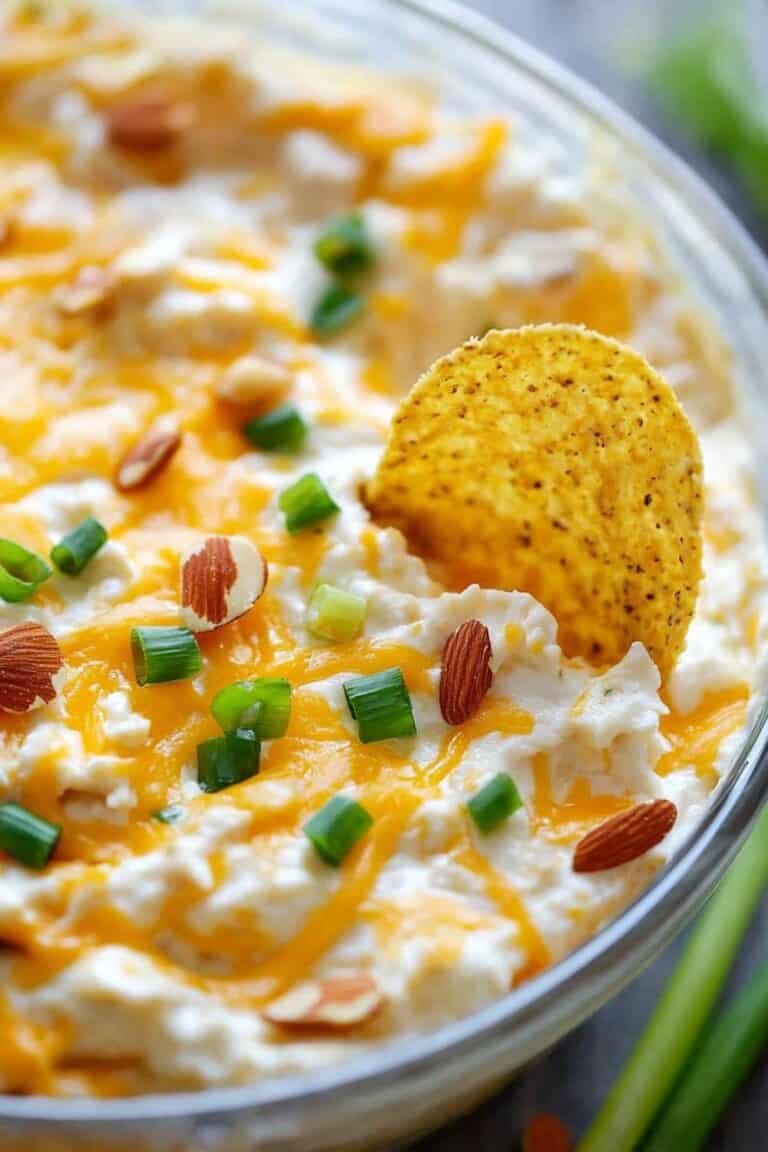 Mix softened cream cheese with mayo, shredded cheddar, sliced green onions, and chopped almonds in a medium bowl.