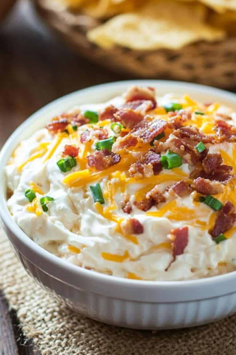 Stir together softened cream cheese, sour cream, shredded cheddar, cooked crumbled bacon, sliced green onions, and a sprinkle of ranch seasoning in a big bowl.