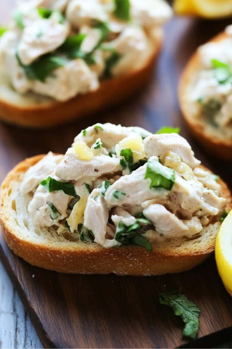 Use leftover chicken and chop it fairly small so it stays put on the bread.