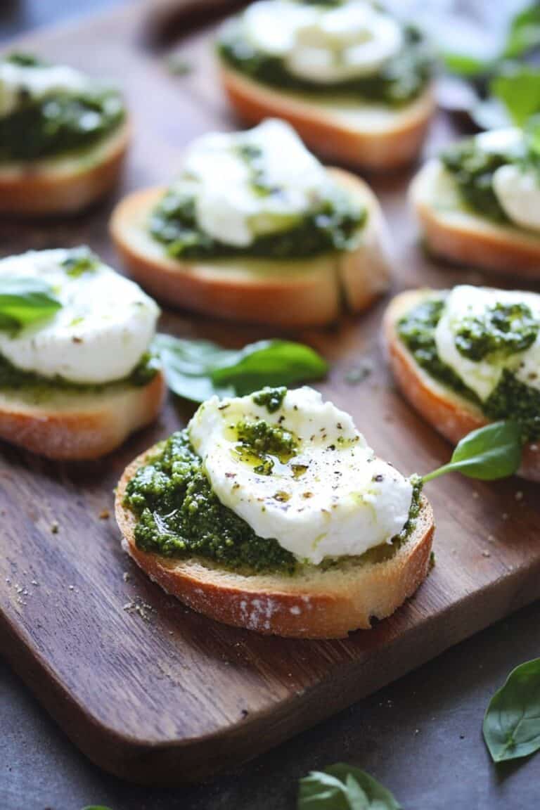 Press the cheese gently into the pesto so it doesn’t tumble off when someone grabs one.