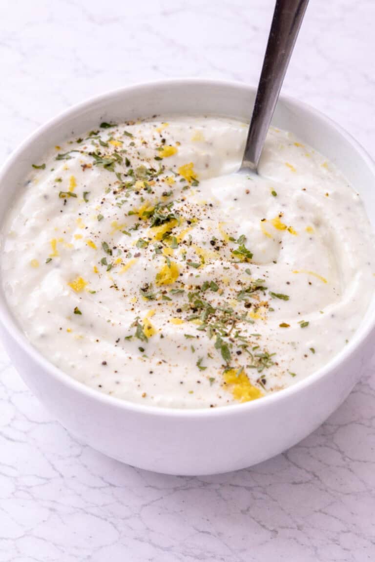 - 1 cup Greek yogurt, 1 to 2 tablespoons fresh lemon juice, 1 garlic clove, olive oil, 3–4 tablespoons water, 1/2 teaspoon sea salt, 1/4 teaspoon freshly ground black pepper