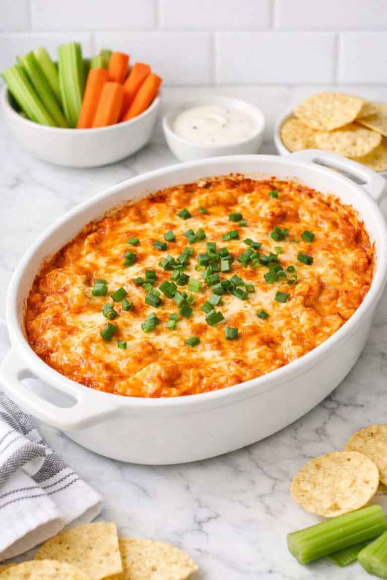 Ingredients: 2cups cooked and shredded chicken, 8 ounces cream cheese, softened, 1/2 cup creamy ranch dressing, 1/2 cup buffalo wing sauce, 1½ cups freshly shredded sharp cheddar cheese, divided