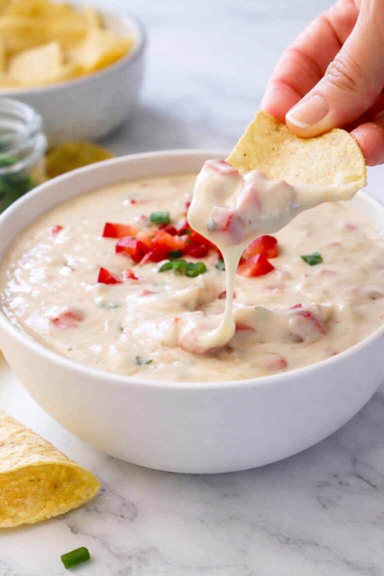 Steps: Cube a 2-pound block of Velveeta Queso Blanco and blend a 4-ounce can of diced green chilies with 2 tablespoons of diced jalapeños, adjusting for heat. Add everything to a saucepan with milk, butter, cumin, and pepper, melt over medium heat while stirring, thin with extra milk if needed, and serve right away.