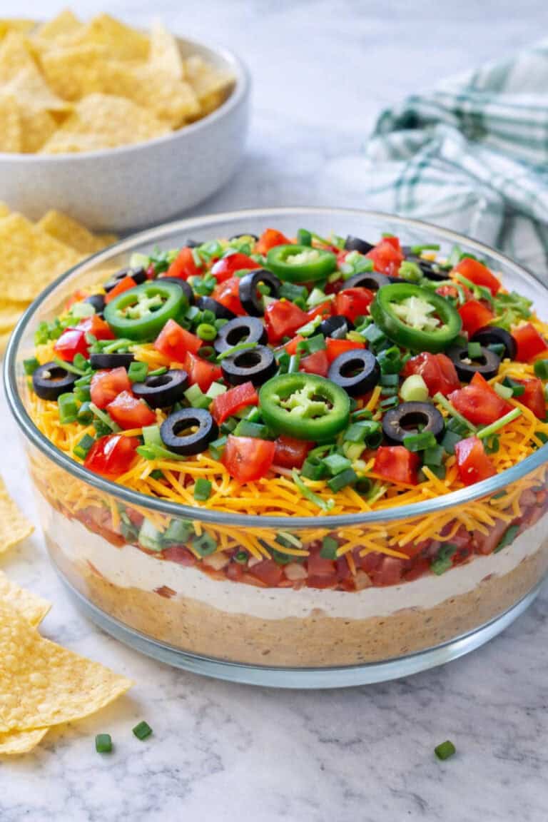 Steps: Mix cream cheese and sour cream in a large bowl with an electric mixer until smooth, then blend in the taco seasoning. Spread into a baking dish, top with romaine, tomatoes, olives, and shredded cheese, and serve right away or chill for 30–60 minutes before serving with veggies, crackers, or chips.