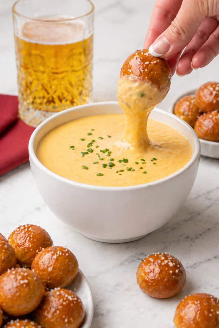 Steps: Melt butter with flour in a saucepan over medium heat, whisking until smooth, then stir in garlic powder, mustard, salt, and pepper and cook for 1 minute. Gradually whisk in beer and cook until slightly thickened, then add cheese a little at a time until melted and smooth, and serve right away with pretzels or bread.