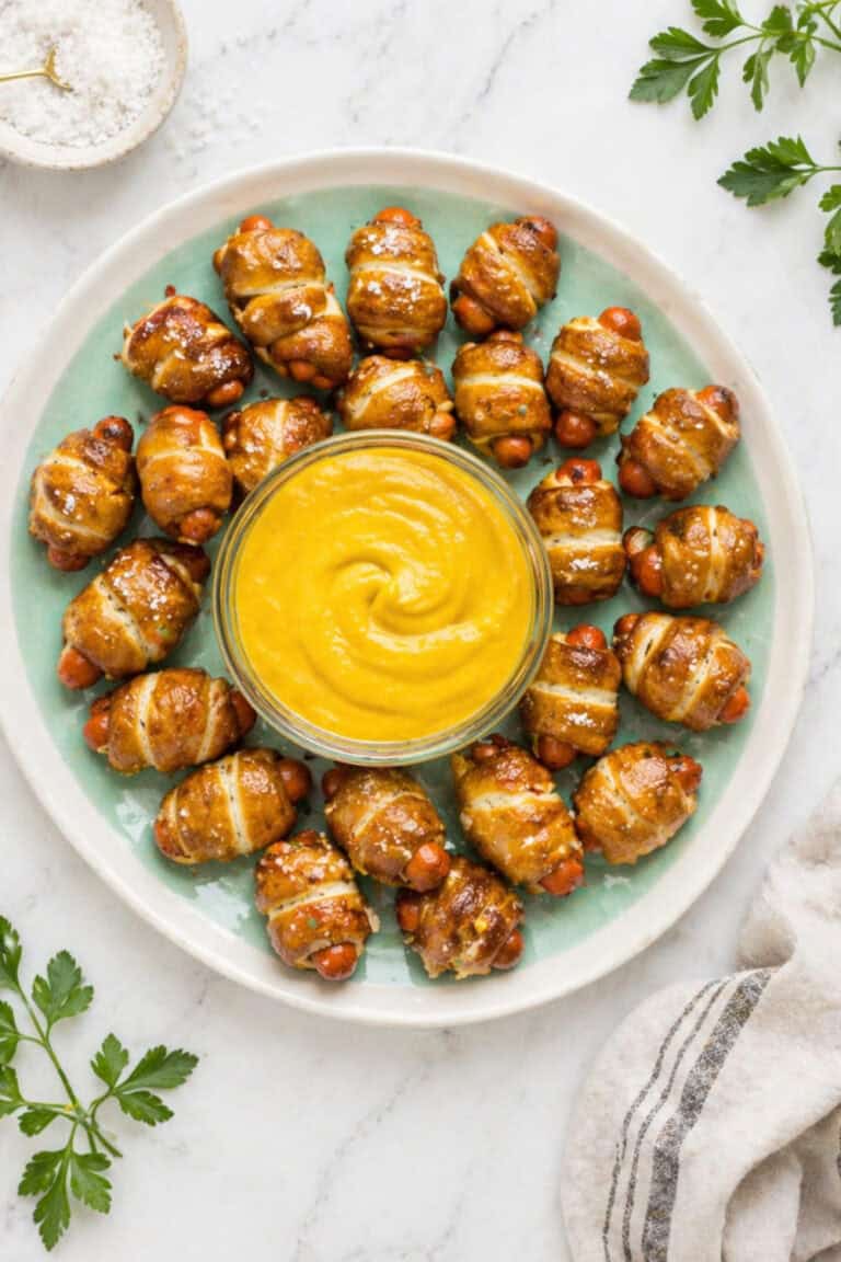 Ingredients for pretzel hot dogs: 5 cups boiling water, 1/3 cup baking soda, 1/4 cup barley malt syrup optional, 1 large egg yolk beaten with 1/2 tablespoon water, pretzel or coarse sea salt, 1 package mini hot dogs, mustard for serving