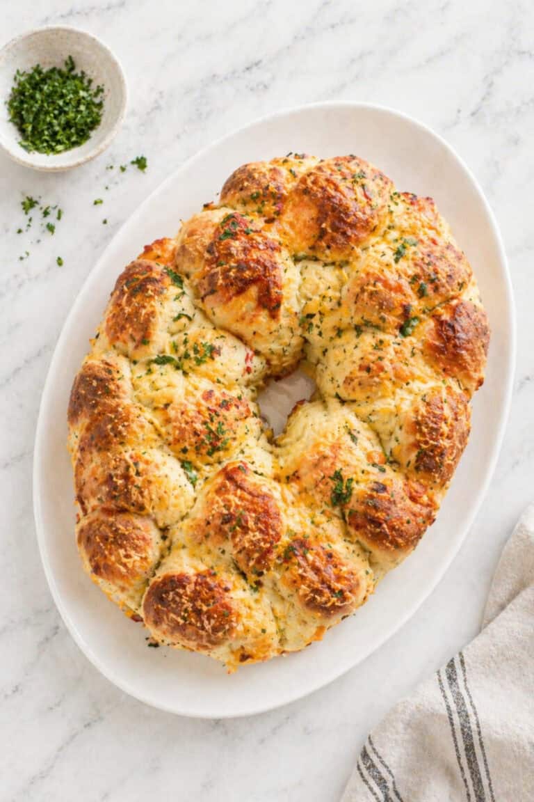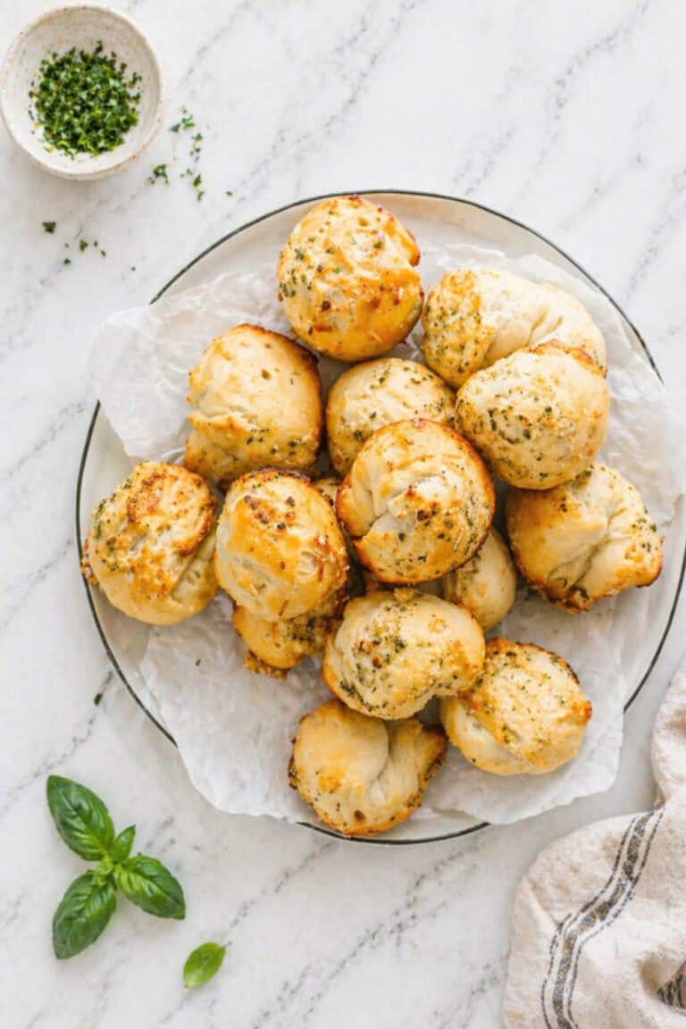 Ingredients: 340 g refrigerated biscuit dough (look for a package of dough that makes 8-10 biscuits), 1/4 cup softened butter, 1/2 tsp dried oregano, 3/4 tsp garlic powder, 1/4 tsp coarse salt, 1/4 tsp chili flakes, pinch ground pepper, 1/2 cup shredded parmesan cheese, optional garnish: fresh basil leaves
