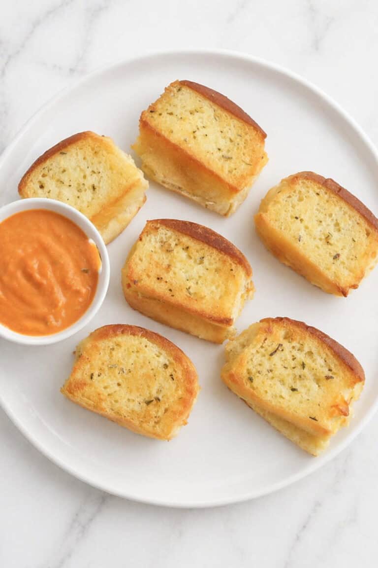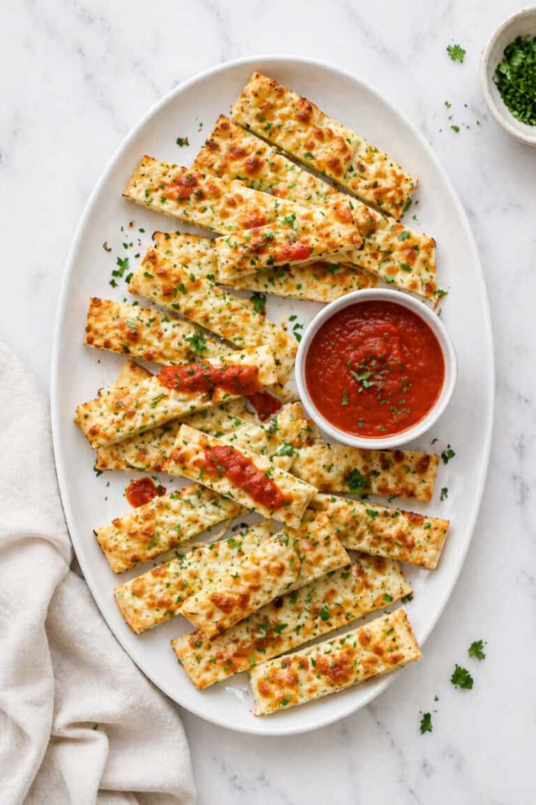 Steps: Preheat the oven to 425°F, spread pizza dough on a baking sheet, brush with garlic butter, and top with seasoning and mozzarella. Bake for 10–12 minutes until golden, then slice into breadsticks and serve with dipping sauce.
