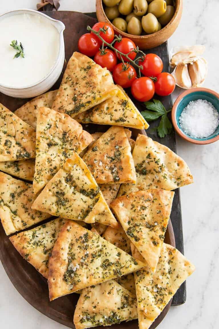 Ingredients: 2 Pita Bread Greek style pita, cut into wedges, /2 cup olive oil, 1 teaspoon granulated garlic, 2 teaspoon parsley dried, 1 1/2 teaspoon oregano dried, 1/2 teaspoon salt kosher