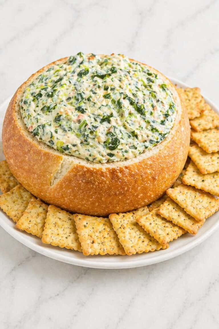 Steps: Chop the water chestnuts, squeeze excess water from the spinach, then mix with mayo, sour cream, and soup mix and chill for 4 hours. Hollow out a bread loaf, fill with the dip, and serve with your favorite dippers.