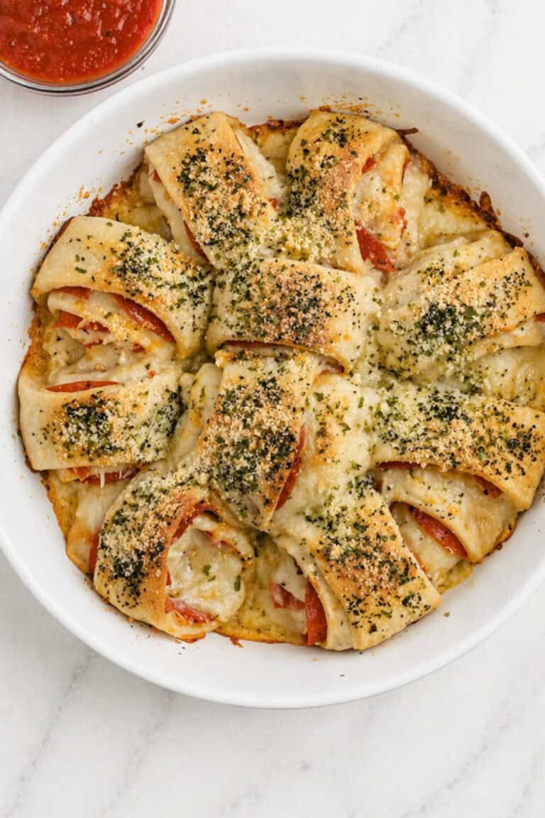 Ingredients: 13.8 ounces pizza dough, 6 ounces pepperoni slices cut in half, 1½ cups shredded mozzarella cheese, 3 tablespoons butter, melted, 1 tsp dried basil, 1 tsp garlic powder, 4 tablespoons grated parmesan cheese, 1 tsp dried parsley, pasta or marinara sauce, for dipping