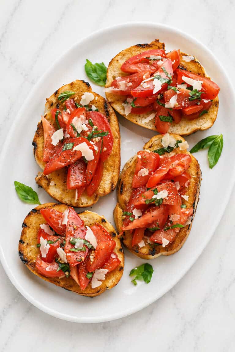 Ingredients: 4 thick slices of Italian or French bread, 2 medium tomatoes, 1 cloves garlic, 2 tablespoons olive oil, 2 tablespoons chopped basil, 1 tsp kosher salt, 1/2 tsp cracked black pepper, 1 tablespoon parmesan shavings