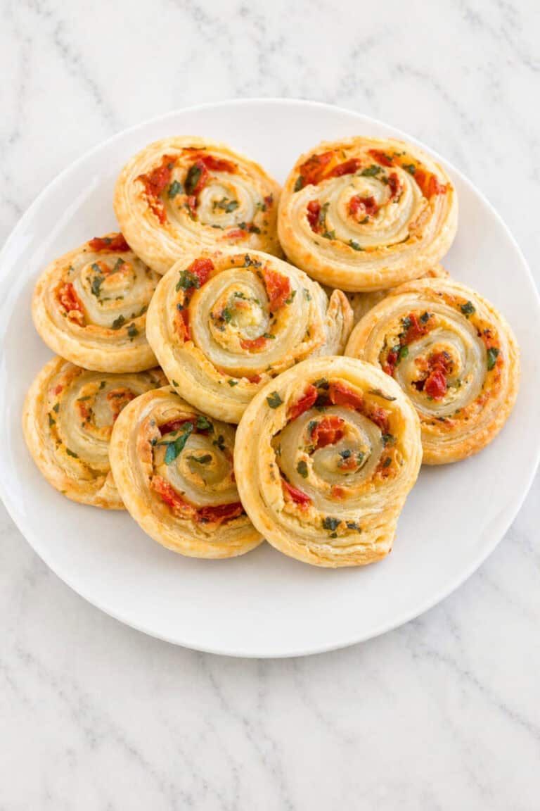 Steps: Preheat the oven to 400°F, roll out the puff pastry, brush with egg wash, spread with cheese and toppings, then roll up and slice into pinwheels. Place on a baking sheet, brush with more egg wash, and bake for 14–18 minutes until golden, then serve.