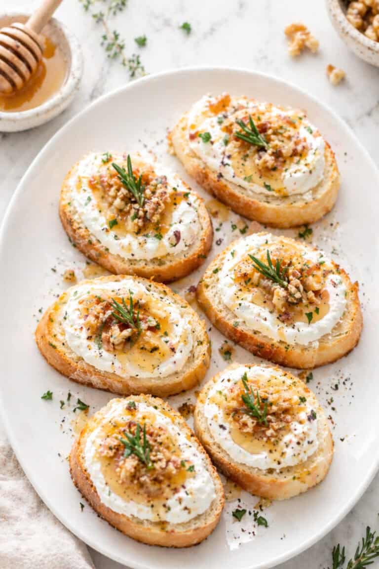 Steps: Toast the baguette slices at 375°F for about 10 minutes (or air fry for 3 minutes), then drizzle with olive oil. Blend ricotta with oil, salt, and pepper until smooth, spread on crostini, and top with pecans, rosemary, and hot honey.