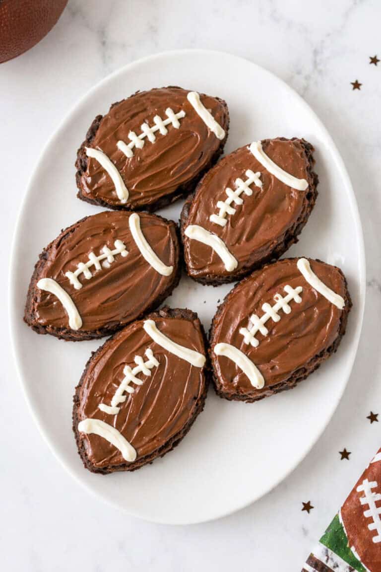 Steps: Preheat the oven to 350°F, bake the brownies in a lined pan, cool, then cut into football shapes using a cutter or by shaping rounds. Frost with chocolate icing, add white frosting laces, and decorate as desired before serving.