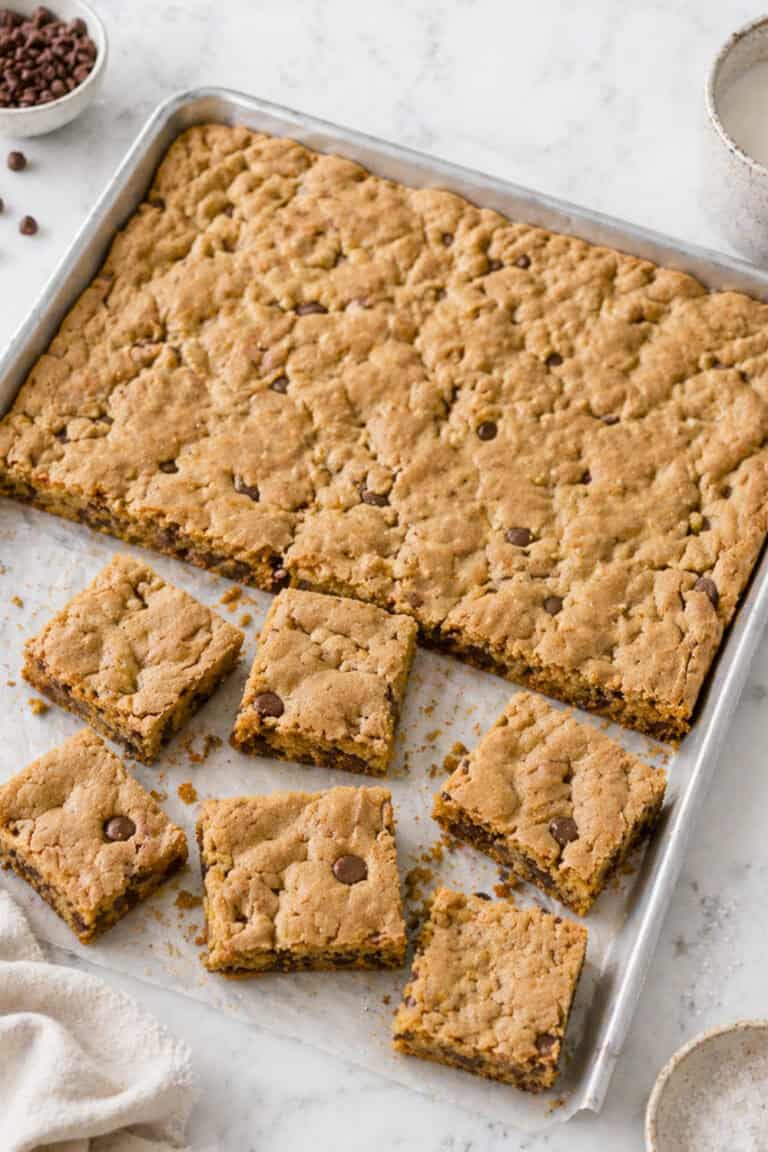 Steps: Preheat the oven to 350°F, mix the wet ingredients, then stir in the dry ingredients and fold in chocolate chips. Press the dough into a lined baking sheet, bake for 15–20 minutes, and cool before cutting.