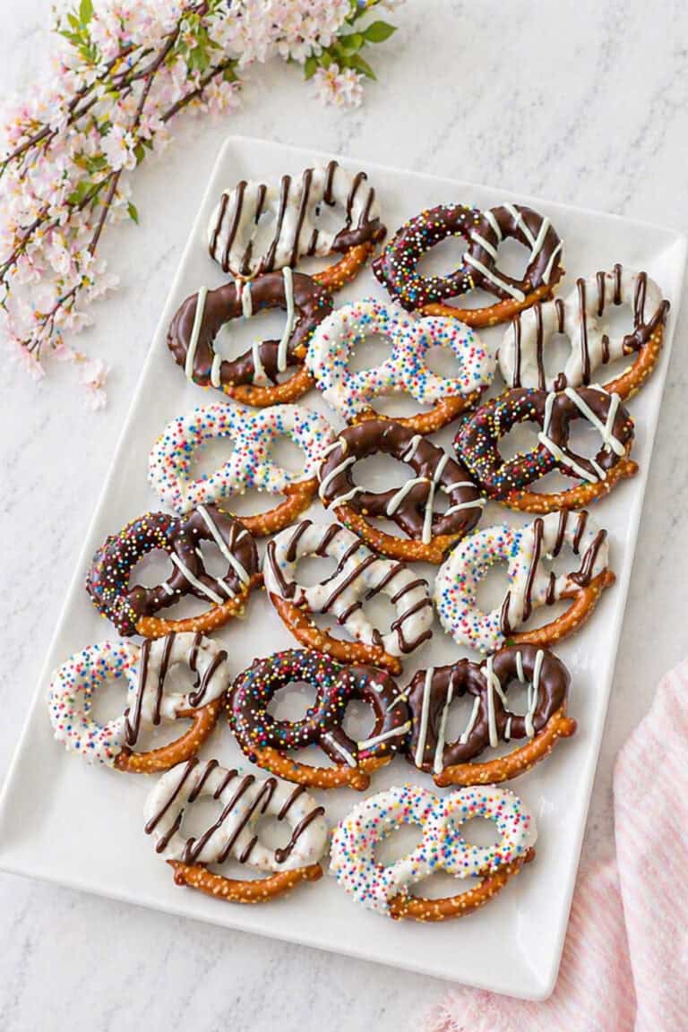 Steps: Line baking sheets and melt the chocolate, then dip pretzels, place on the sheets, and add toppings or drizzle while still wet. Let set until firm, then store in an airtight container or serve.