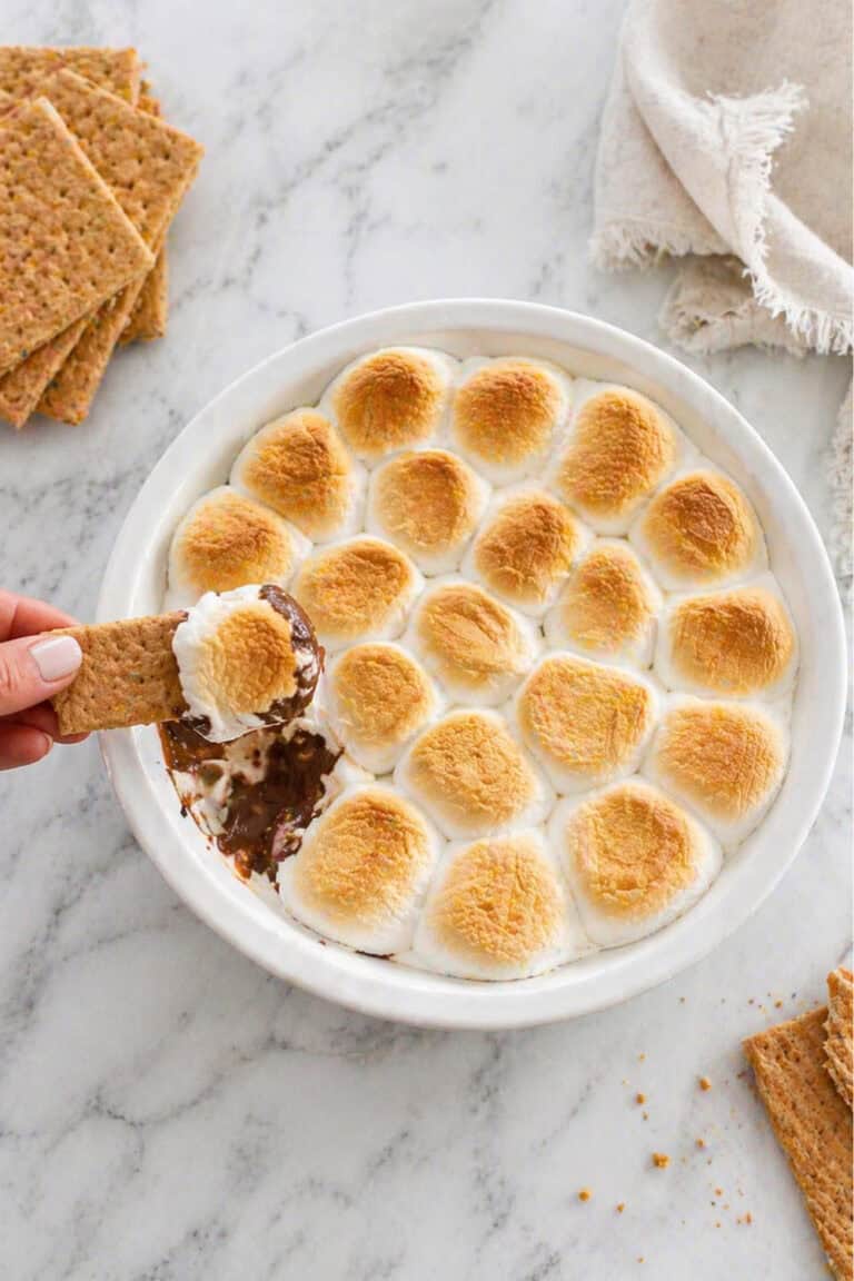 Steps: Preheat the oven to 350°F, melt the chocolate in a pie pan, then top with marshmallows and bake until softened. Broil briefly until golden, then serve right away with graham crackers.