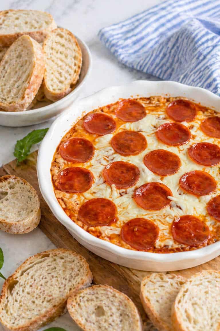Steps: Preheat the oven to 350°F and spread a mixture of softened cream cheese and Italian seasoning into a greased 9-inch pie dish, layering half the Parmesan and mozzarella, then topping with pizza sauce, remaining cheese, and pepperoni. Bake for 20–25 minutes until hot and bubbly, then finish with fresh basil and serve with chips, pretzels, or crackers.