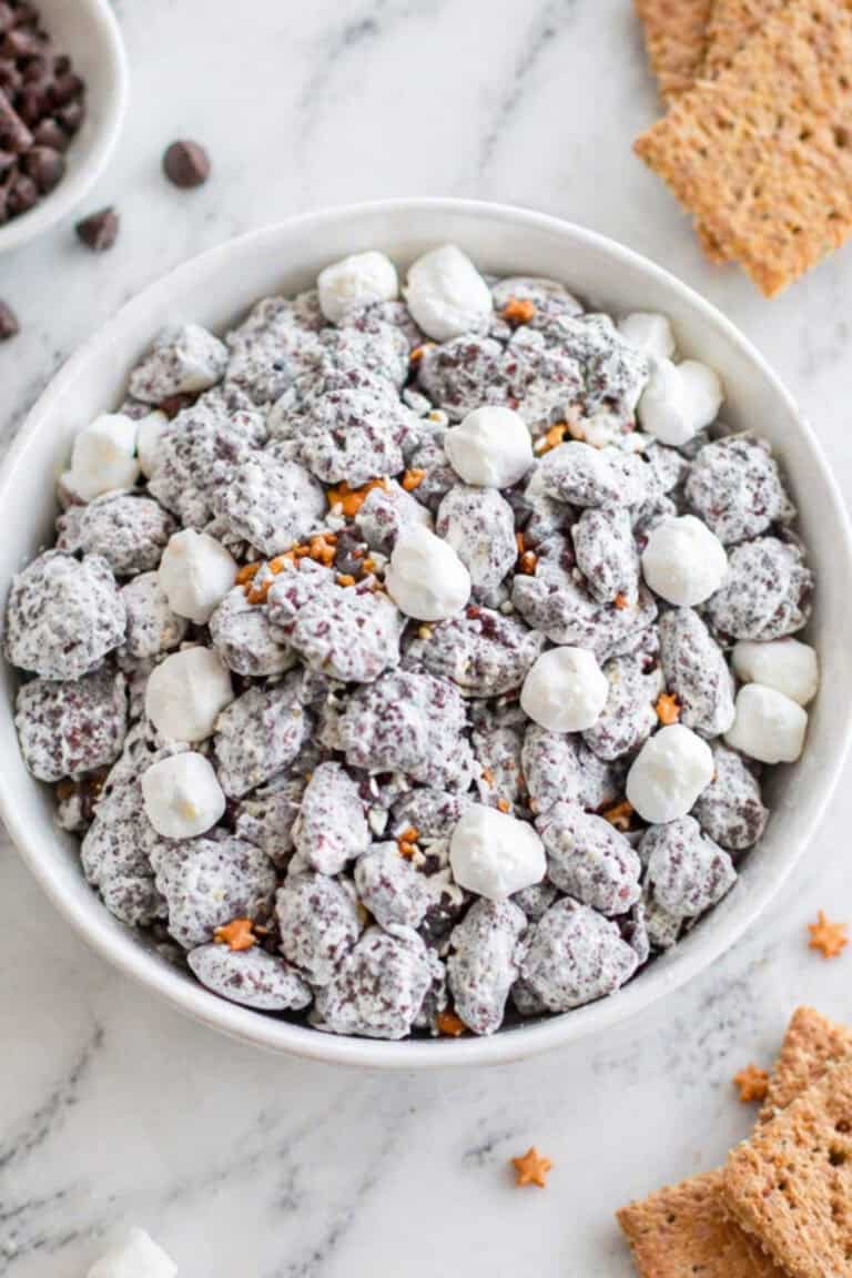 Steps: Melt the chocolate chips and peanut butter until smooth, then pour over Crispix and stir to coat. Toss with powdered sugar, add marshmallows if using, spread to cool, and serve.