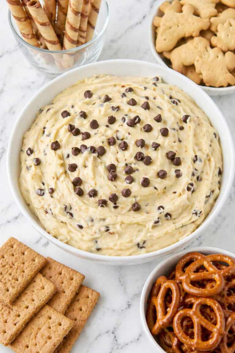 Steps: Beat the cream cheese and butter until smooth, then mix in brown sugar, oats, vanilla, salt, and confectioners’ sugar until combined. Stir in chocolate chips, chill if desired, and serve with extra chips on top.