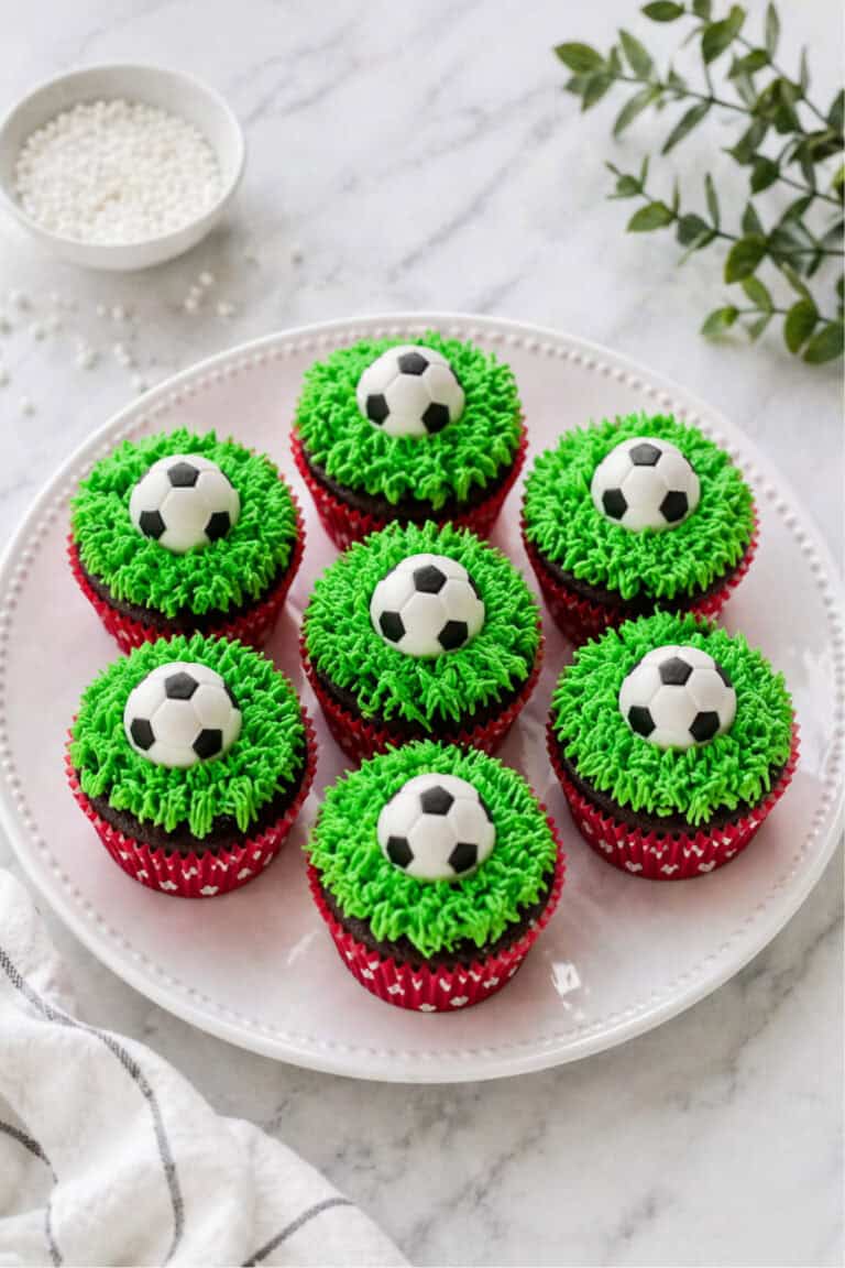 Steps: Bake the cupcakes, let them cool completely, then scoop out the center and place a clean soccer ball candy inside each one. Using a grass icing tip, pipe grass starting close to the soccer ball and work outward in small clusters until the entire cupcake is covered.