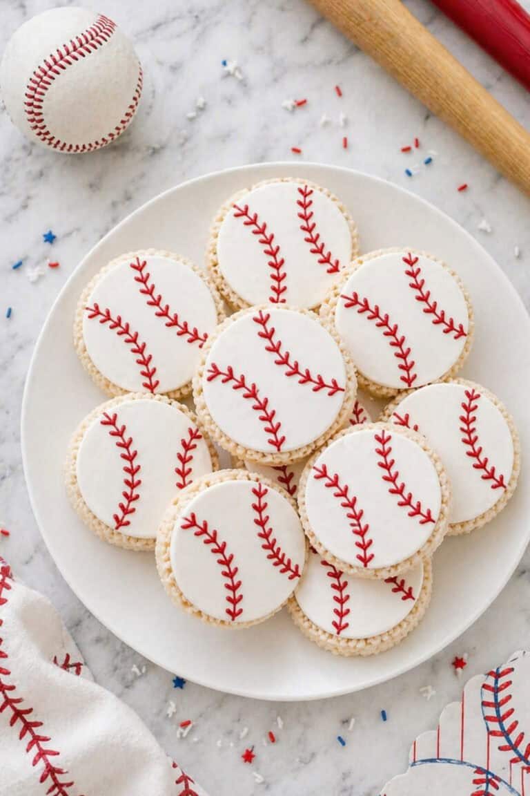 Steps: Melt the butter over low heat, add the marshmallows, and stir until mostly melted, then remove from heat and continue stirring until smooth. Mix in the Rice Krispies, press into a buttered 13×18-inch pan, let cool for at least an hour, and cut into circles. Melt white chocolate, cool slightly, mix with corn syrup, knead until smooth, roll thin, cut circles, and draw on baseball laces with food coloring. Spread marshmallow fluff on each treat, top with a modeling chocolate piece, and serve.