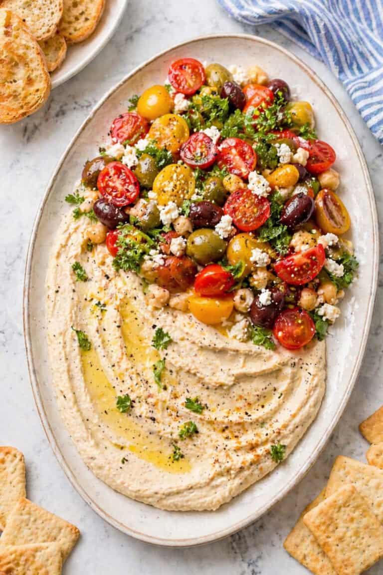 Steps: Spread hummus evenly over a platter, then layer one side with parsley, tomatoes, olives, chickpeas, and a generous sprinkle of feta cheese. Finish with cracked black pepper, paprika, and a drizzle of olive oil, then serve with pita bread or chips.