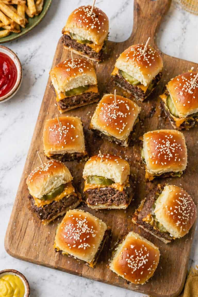 Ingredients: 2 pounds ground beef, 1 1/2 teaspoons salt, 2 teaspoons onion powder, 2 teaspoons garlic powder, 1 teaspoon paprika, 1 tablespoon Worcestershire sauce, 1 small onion, 1 tablespoon olive oil, 1 package Hawaiian rolls, 1/2 pound cheddar cheese, 1 tablespoon butter, 2 teaspoons sesame seeds, pickles, ketchup, mustard.