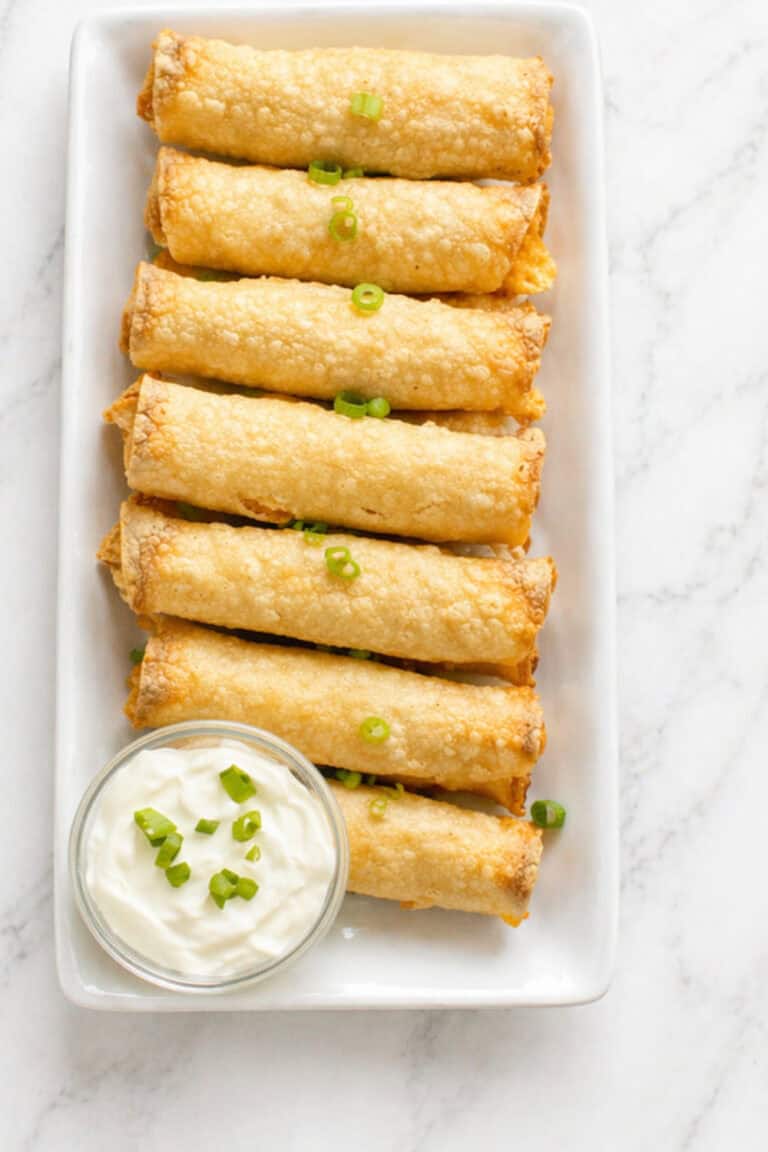 Steps: Preheat the oven to 400°F, blend the chicken, sour cream, cream cheese, and taco seasoning, then stir in shredded cheese. Fill and roll warmed tortillas, place on a pan, spray with oil, and bake for 20 minutes until crispy and golden.