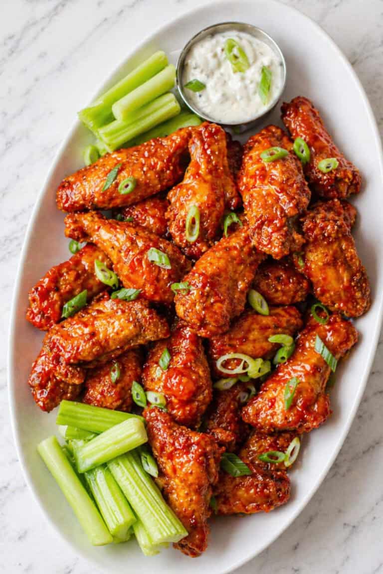 Steps: Preheat the oven to 400°F, place seasoned wings on a greased wire rack, and bake for 35–40 minutes until crispy. Simmer the hot sauce, honey, and butter until slightly thickened, then toss with the baked wings and serve with dipping sauce and celery.