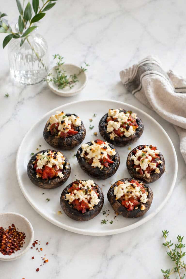 Steps: Preheat the oven to 350°F, place mushrooms in a baking dish, and top with bacon, tomatoes, feta, and a drizzle of olive oil. Bake for 15–20 minutes until tender and heated through, then serve.