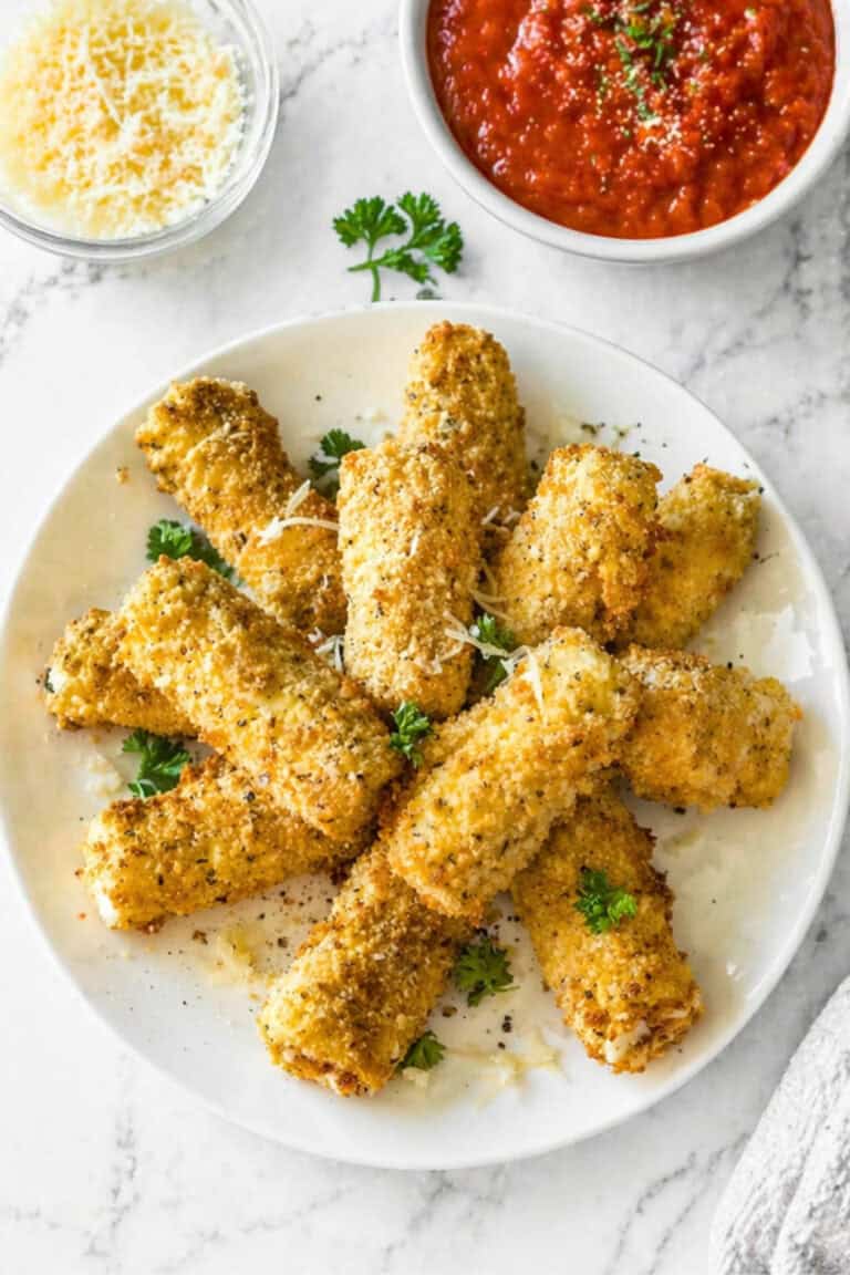 Steps: Set up three bowls with egg and water, seasoned flour, and a breadcrumb mixture, then coat each cheese stick by dipping in egg, flour, egg again, and breadcrumbs before placing on a lined baking sheet. Freeze for at least 40 minutes, then air fry at 400°F for 5–7 minutes until golden and serve immediately with marinara sauce.