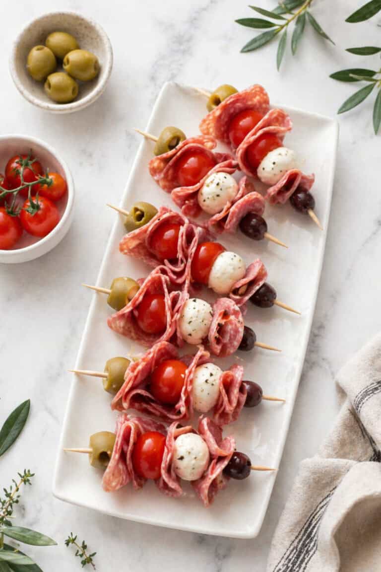 Ingredients: Kalamata olives whole, pitted, marinated mozzarella balls, salami, cherry tomatoes, green olives whole, pitted