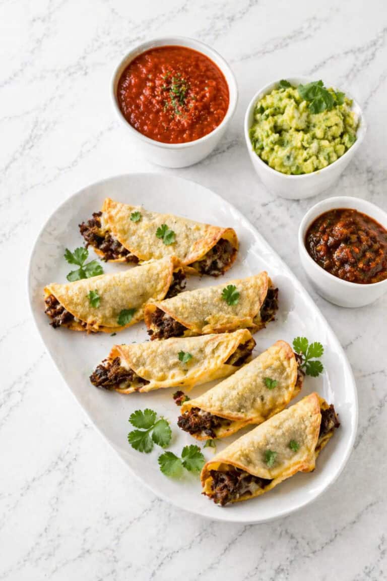 Ingredients: 10 mini corn tortillas, ½ cup extra sharp cheddar shredded, 1 cup taco meat, guacamole, salsa