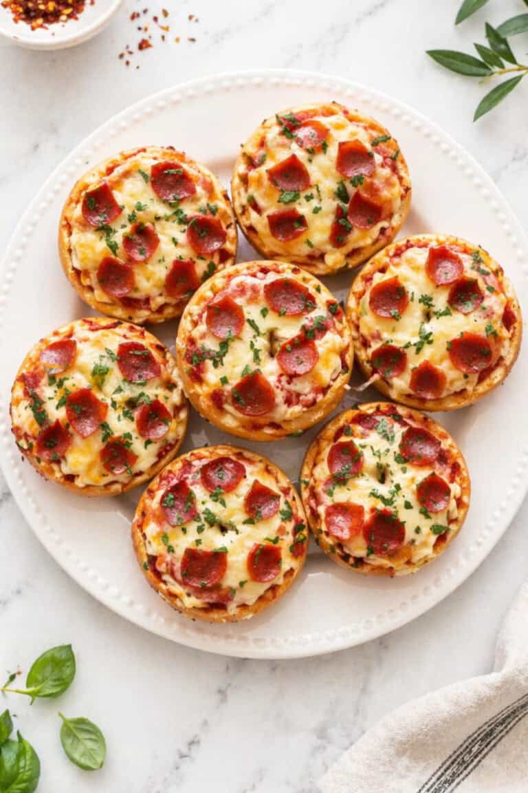 Steps: Preheat the oven to 400°F and place mini bagels on a lined baking sheet, then top with sauce, cheese, and your favorite toppings. Bake for 10–12 minutes until the bagels are crisp and the cheese is golden, then serve immediately.