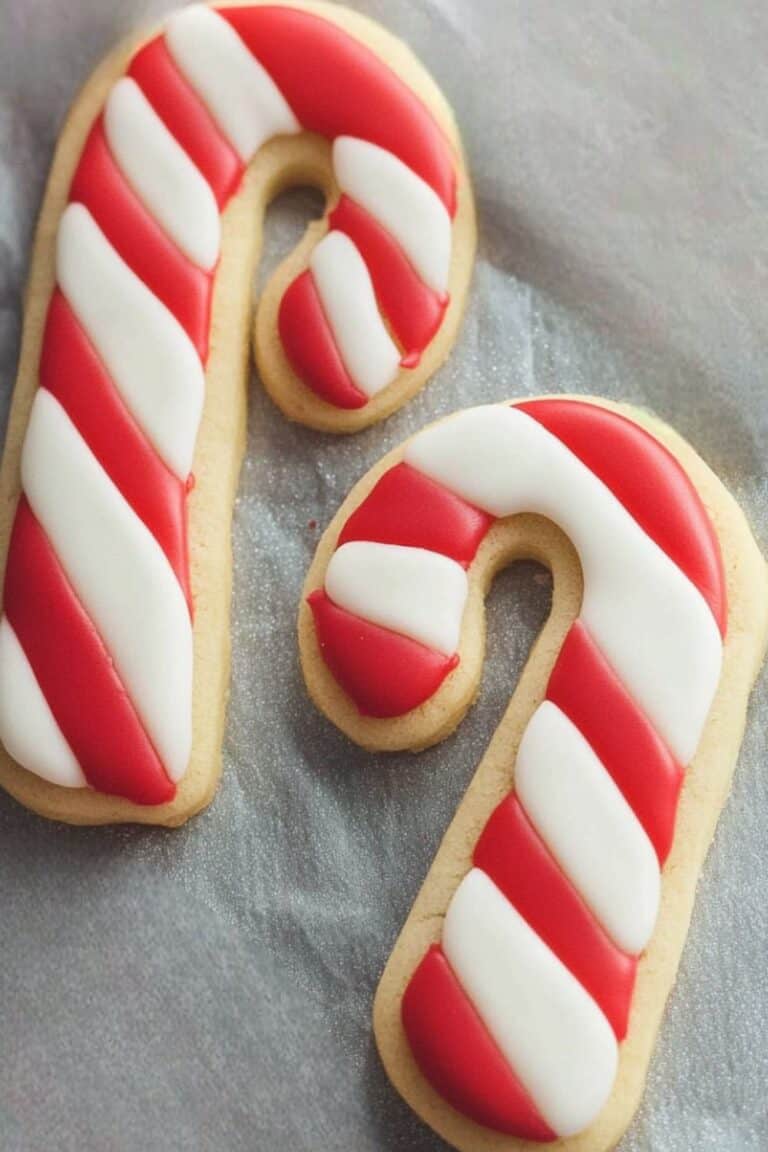 Cut candy cane shapes and use red and white icing to make the stripes.