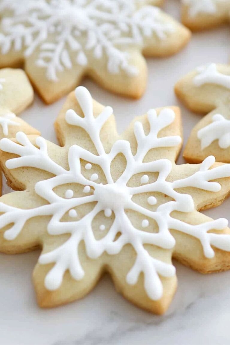 Use a snowflake cookie cutter to make the shape and cover each cookie in white icing.