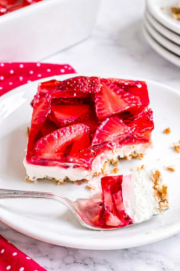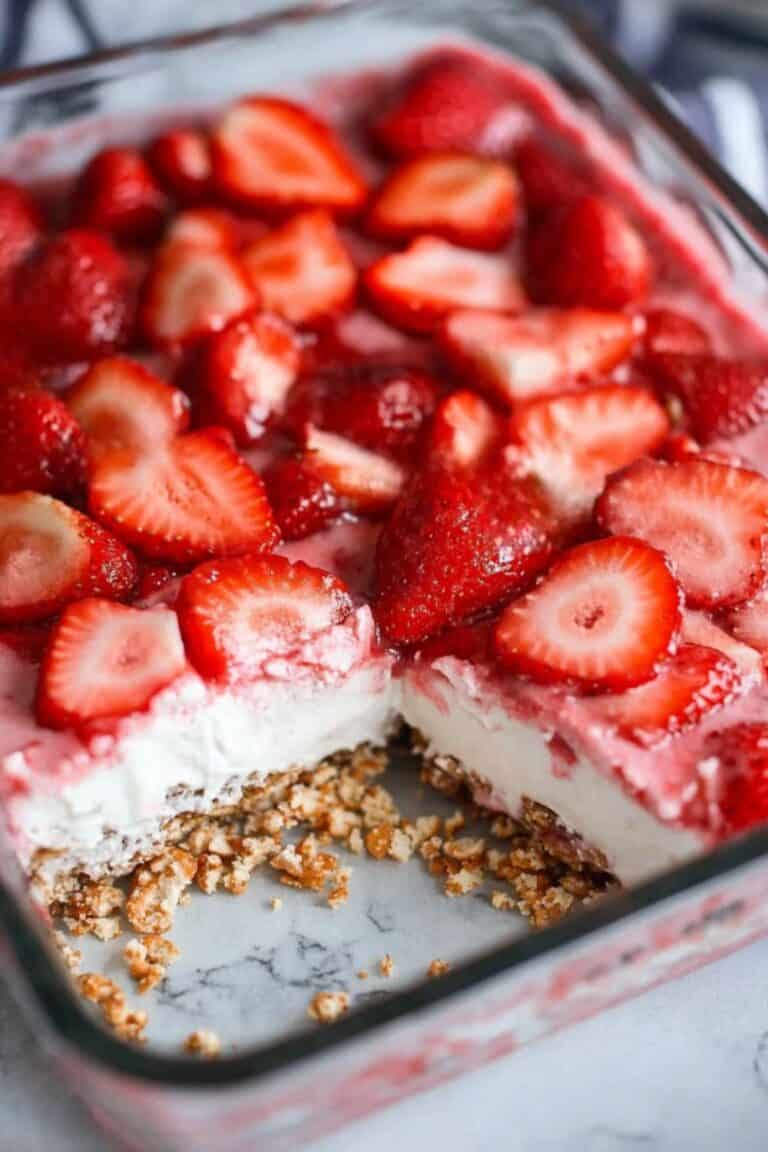 This is my mom’s favorite dessert but she always called it strawberry pretzel salad.